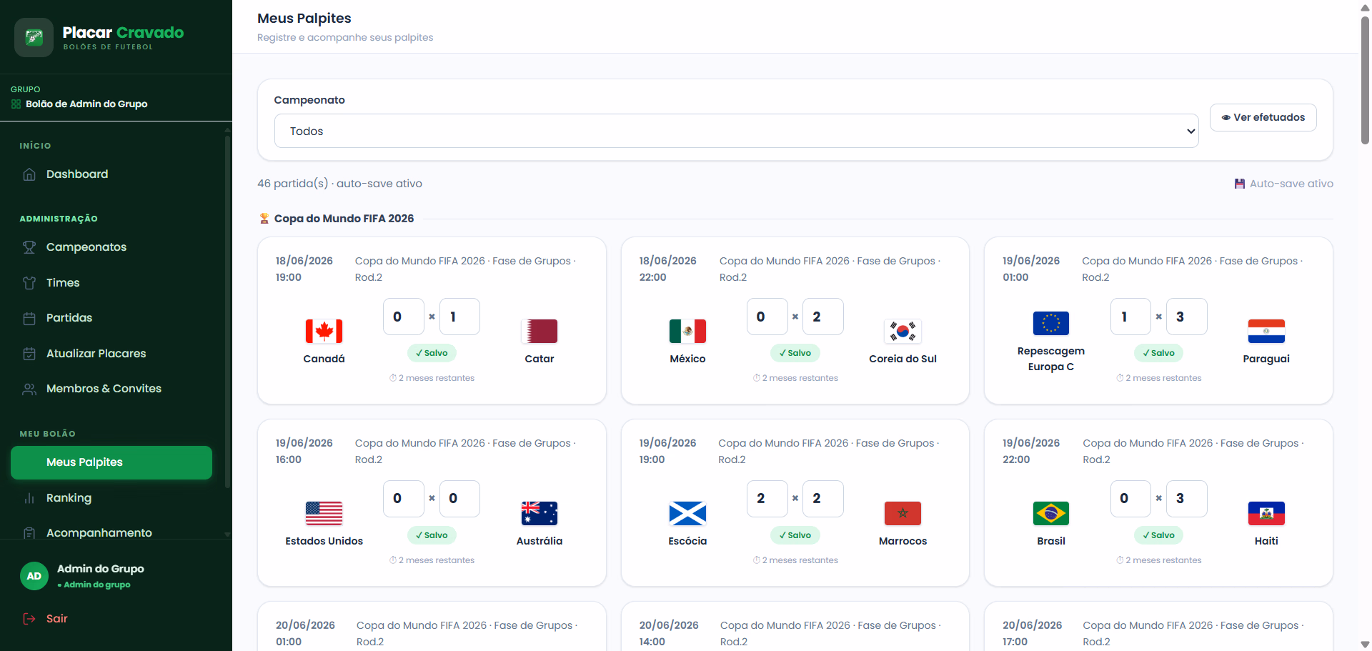 Pare de perder tempo organizando bolão manualmente. Aqui cada participante lança seu palpite, o sistema calcula tudo automaticamente e o ranking atualiza em tempo real.